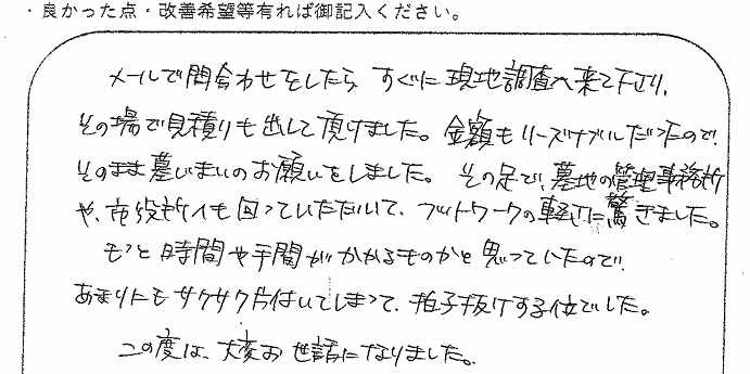 今回は千葉市営平和公園墓地にて墓じまい工事のご契約者様からです。墓じまいの際に必要な改葬申請も当社にて代行いたしました。遠方の墓地等の墓じまいの場合には、当社にて改葬申請の代行もしております。 今回は千葉市営平和公園墓地にて墓じまい工事のご契約者様からです。墓じまいの際に必要な改葬申請も当社にて代行いたしました。遠方の墓地等の墓じまいの場合には、当社にて改葬申請の代行もしております。