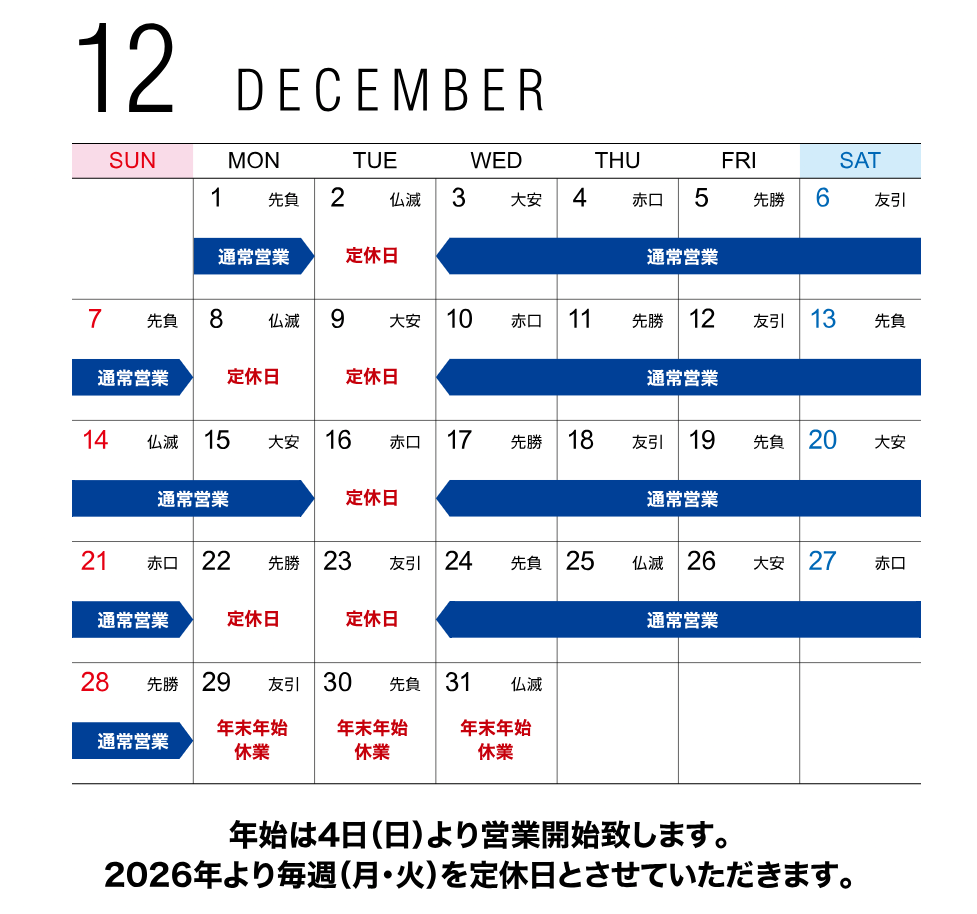 2025年12月営業カレンダーを作成致しました。土曜日、日曜日、祝日のご相談も無料です。